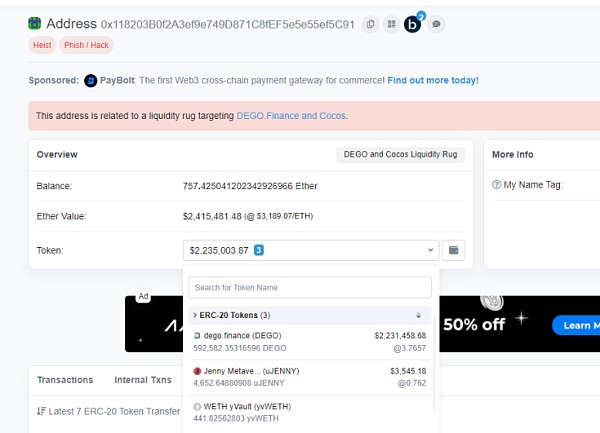 首先,项目方私钥泄露的DEGO.Finance: Deployer地址为:
